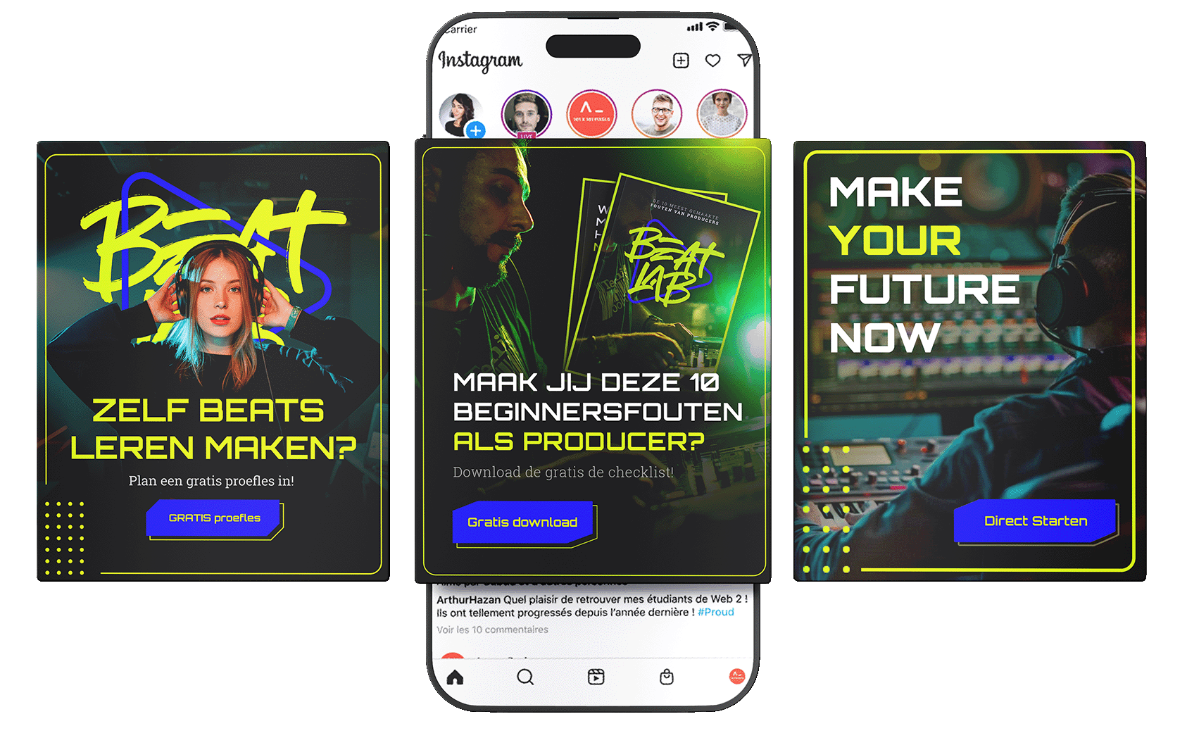 Voor socials ontwikkelden we visuals die de energie van Beatlab uitstralen en direct opvallen in de feed. Elk ontwerp is herkenbaar, doelgericht en opgebouwd met een duidelijke intentie om interactie te stimuleren en leads te genereren.