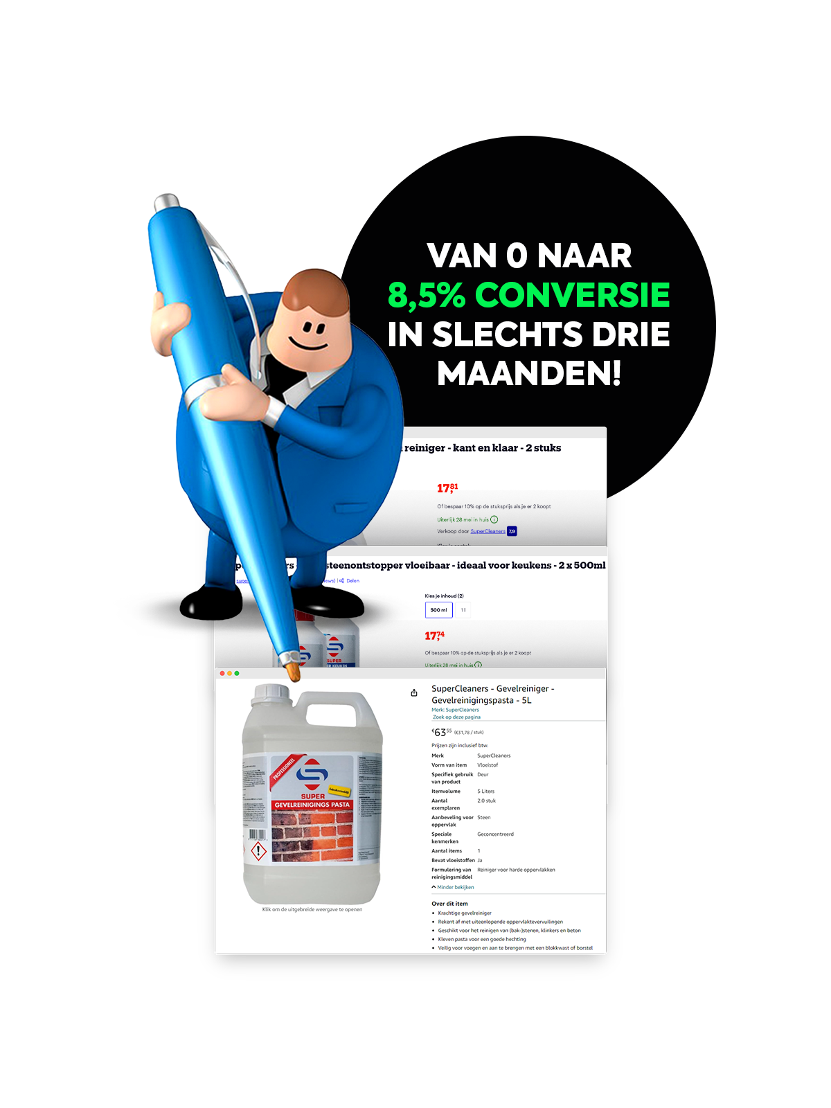 Het begint met een kwalitatief product. Een product dat niet aan de verwachtingen voldoet heeft weinig zin. Daarom gingen we aan de slag met de productpagina: titel, foto’s, content, specificaties, prijs en levertijd vormen de basis om goed te kunnen presteren. Daarna werd aan de slag gegaan om eerlijke recensies te krijgen. Door deze wisselwerking kwamen verschillende reinigingsproducten van SuperCleaners op de eerste pagina terecht. De conversie nam geweldig toe, van 1,3% in januari naar 8,5% in mei.